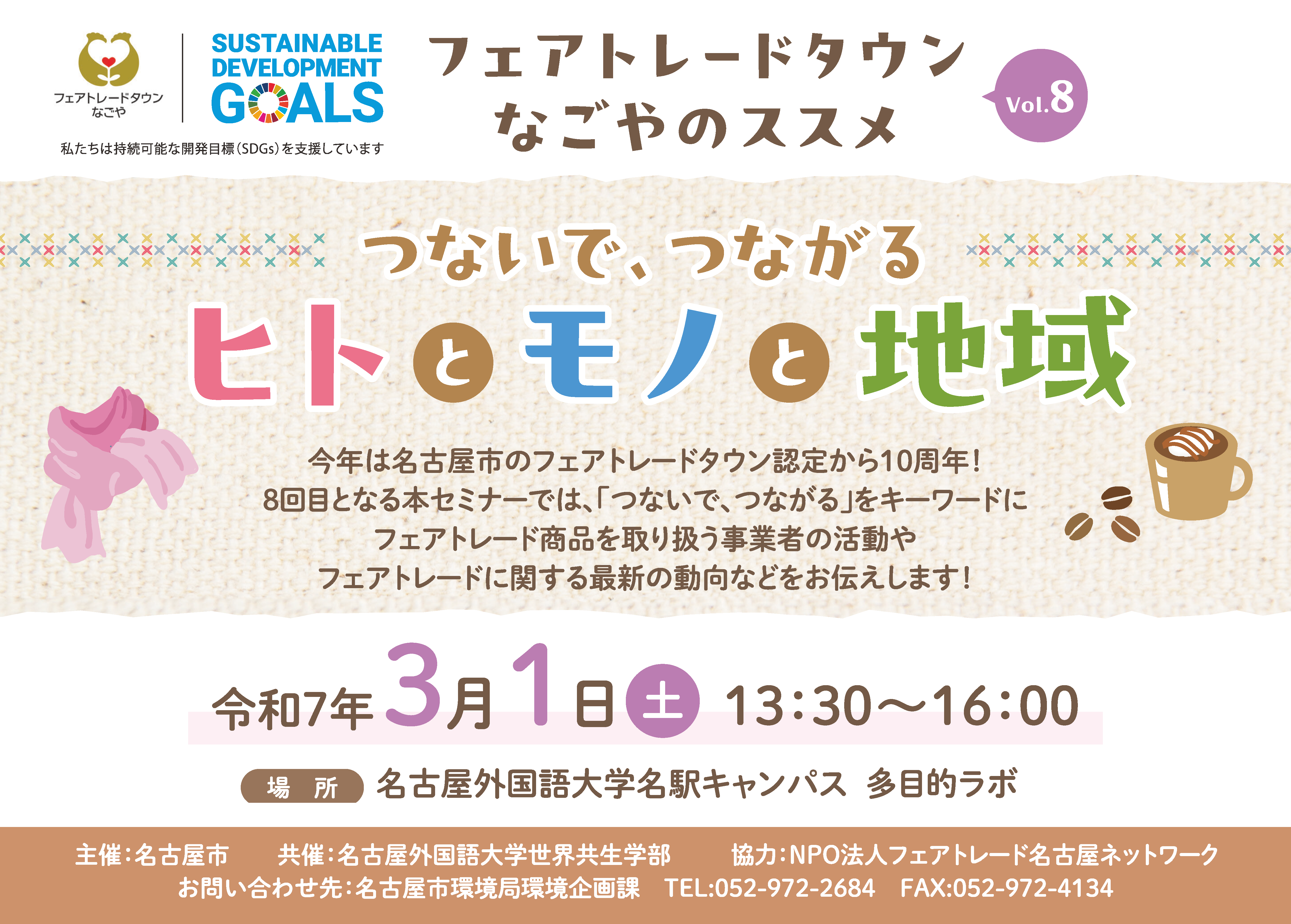 FTNNは行政や企業への働きかけも積極的に行っており、名古屋市環境局ではフェアトレード認証コットンの作業着(約1000着)の導入が進み、市立小学校給食(12万食)でのフェアトレード認証ゴマの提供は今年で5年目。これらは国内でのフェアトレード公共調達の先進事例となっています。市役所の2つの食堂では、フェアトレード認証コーヒーの提供も始まり、市民と行政との連携でフェアトレードタウンなごやは成長をしております。